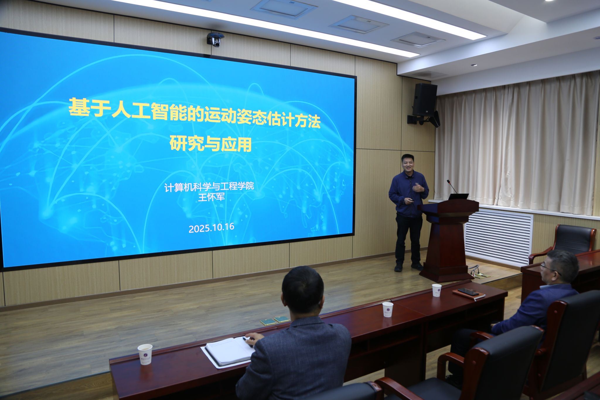 计算机科学与工程学院王怀军作了题为《基于人工智能的运动姿态估计方法研究与应用》的学术报告。报告结合研究成果与实际案例,分别就人工智能数据采集标准化、AI模型适配性、运动姿态捕捉、动作规范性判断中的技术与方法、场景的应用等做了介绍。为中心后续研究提供技术支撑和前沿学术参考。